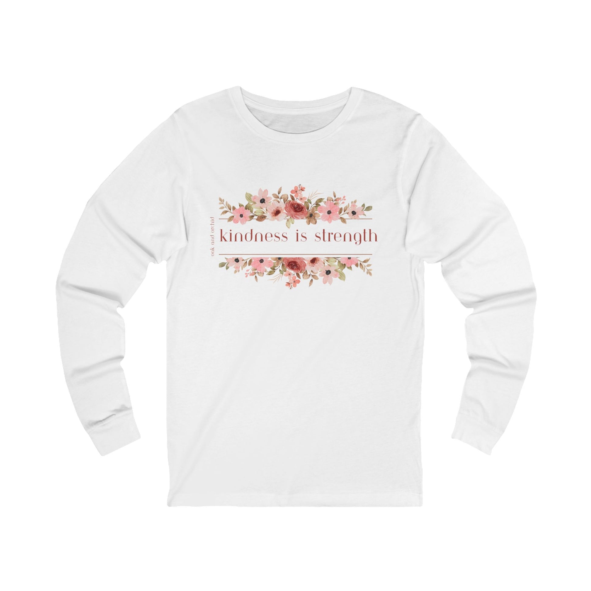 Embrace warmth and style with our Unisex Jersey Long Sleeve Tee, perfect for those cozy days when you want to express kindness and positivity. With a floral design that features the inspiring phrase 'kindness is strength', this tee brings a sense of calm and encouragement to your wardrobe. Ideal for casual outings, this versatile piece can be layered or worn alone, making it a fantastic option for everyday wear or special occasions like birthdays, anniversaries, or just a thoughtful gift for friends and family. Designed for adults, it fits seamlessly into the lifestyle of anyone who values comfort and motivation, making it perfect for self-care days or while running errands. Embrace the spirit of positivity and spread kindness wherever you go!